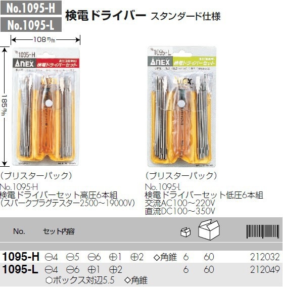 Bộ bút thử điện 6 mũi điện áp cao(H) Anex No.1095-H. Là sản phẩm cao cấp đến từ Nhật bản. Bút thử điện cao áp loại dùng cho ô tô (máy thử bugi). Loại thay thế được cho các loại vít. Phạm vi phát hiện: Máy kiểm tra bugi 2500 – 19.000 V. Chức năng phát hiện điện: Máy kiểm tra bugi. Đi kèm với Ống đèn neon phát sáng. Bộ sản phẩm Bao gồm: Tay cầm tĩnh điện, 6 bit (-4, -5, -6, +1, +2, vuông), túi đựng . Giúp người dùng sử lý công việc nhanh chóng và hiệu quả.