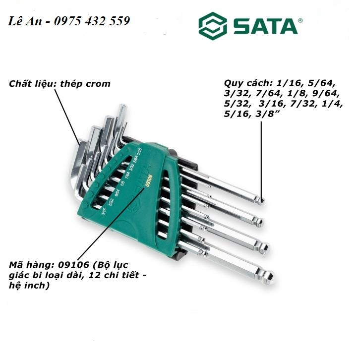 Sata 09106 là bộ lục giác đầu bi thân dài 12 chi tiết hệ inch chuyên dụng để tháo lắp các loại bu lông, ốc vít chìm trên các thiết bị, máy móc hoặc xe cộ sử dụng chuẩn Mỹ.