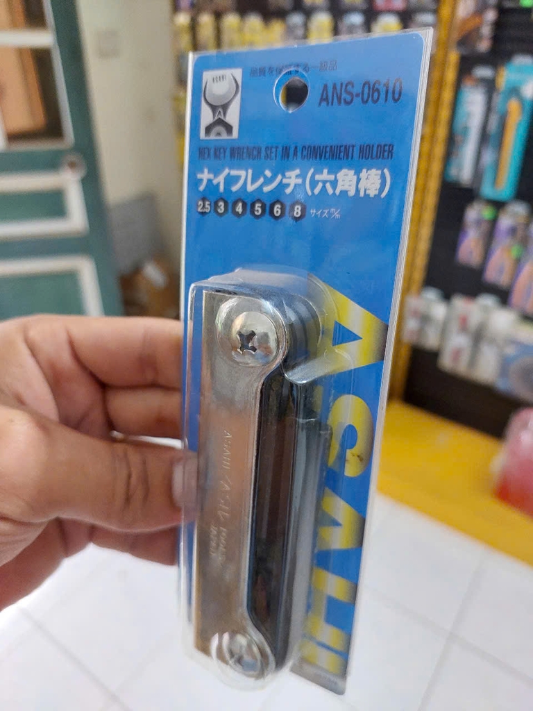 Bộ lục giác gấp gọn 6 chi tiết Asahi ANS0610 Là sản phẩm cao cấp đến từ Nhật bản. Chất liệu: Thép Chrome vanadi siêu bền. Xử lý bề mặt: nhuộm đen. Bộ cờ lê lục giác được sử dụng như một con dao bỏ túi bằng cách chỉ kéo ra kích thước yêu cầu. Bộ lục giác gấp gọn gồm 6 chi tiết dùng để Siết chặt bu lông lục giác và vít định vị lỗ lục giác. Giúp cố định các chi tiết một cách dễ dàng, nhanh chóng và hiệu quả .