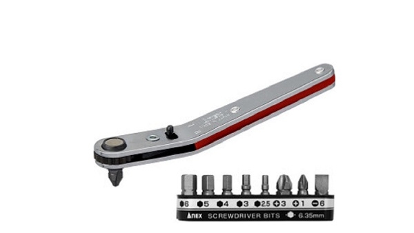 Bộ tay vặn và mũi vít dùng trong góc hẹp Anex No.429. Là sản phẩm cao cấp đến từ Nhật bản. Loại bù tiện lợi để vặn vít ở những nơi hẹp. Cơ chế bánh cóc cho phép bạn xoay các vít với công việc lặp lại sang trái và phải mà không cần thay đổi tay cầm. Đầu siêu mỏng 0,8 inch (21 mm) với mũi siêu ngắn. Số bánh răng: 16. Hình dạng tay cầm: Loại đầu cong