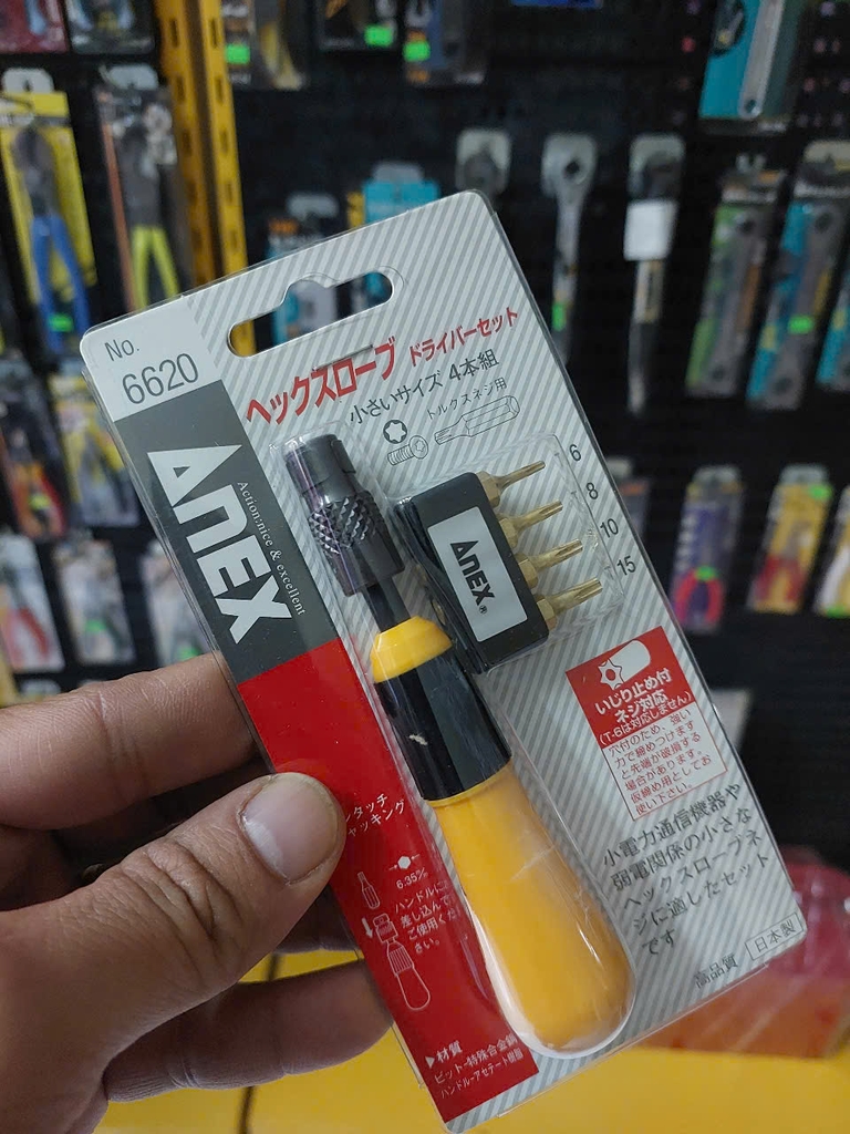 Bộ vít đa năng tự động kèm mũi vít Anex No.6620 là sản phẩm cao cấp đến từ Nhật bản. Gồm 4 mũi vít lục giác hoa thị (6 rãnh) với tốc độ truyền mômen xoắn cao. 1 tay vặn đa năng thích hợp với vít lục giác nhỏ cho các thiết bị điện như bộ đàm.v.v… Loại thay thế vít ngắn.