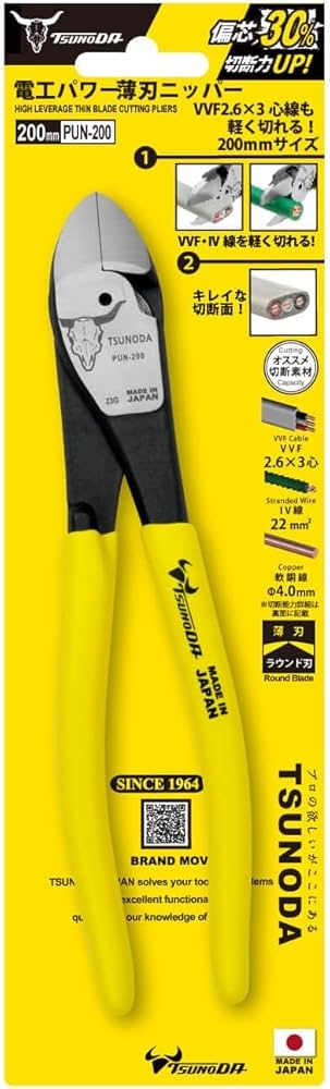 Kìm cắt cáp VVF Tsunoda PUN-200 : Chất liệu thép hợp kim đặc biệt , độ cứng cao nhất tới 64 HRC .Kết cấu lệch tâm và tay cầm đàn hồi giúp giảm lực cần thiết khi cắt tới 30%