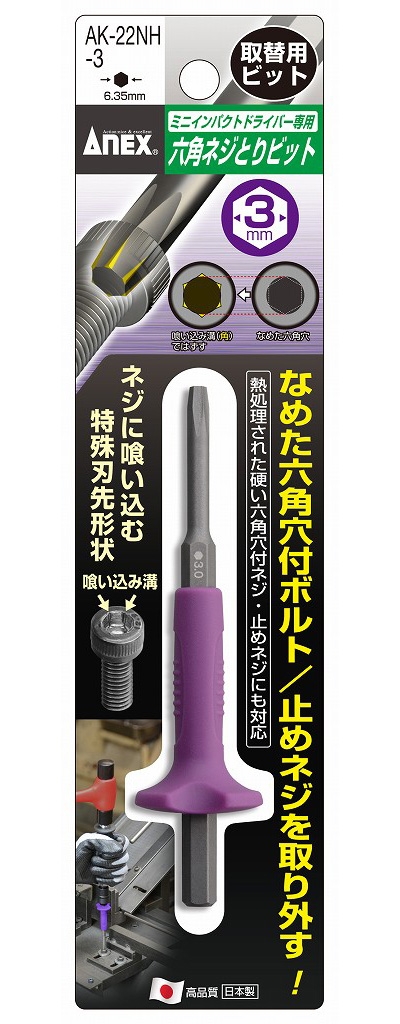 Mũi vít tháo vít gỉ lục giác Anex AK-22NH-3 là sản phẩm cao cấp đến từ Nhật bản. Được làm từ chất liệu hợp kim đặc biệt Thép crom-molypden-vanadi, TPE. Mũi vít được thiết kế đặc biệt để tháo và tạo rãnh mới trên vít lỗ lục giác.Cũng có thể được sử dụng với vít được xử lý nhiệt như vít nắp và bộ tráng men. Có thể được sử dụng với trình điều khiển tác động thủ công có trục lục giác 0,25 inch (6,35 mm) ở phía đối diện. Kích thước tương thích: Tương thích với các hình lục giác 0,1 inch (3 mm)