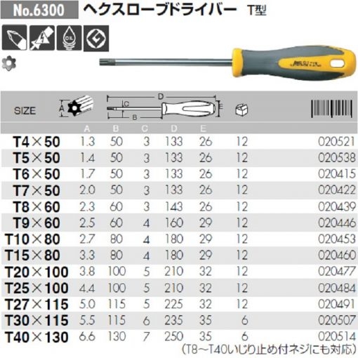 Tô vít hoa thị có lỗ Anex No.6300-T4x50 là sản phẩm cao cấp đến từ Nhật bản. Tuốc nơ vít lục giác với tốc độ truyền mômen xoắn cao (6 rãnh). Hình dạng mặt cắt ngang của tay cầm gần như hình vuông nên dễ dàng tác dụng lực. Vật liệu làm bằng thép vanadi Chrome molypden chất lượng cao từ Nhật Bản với độ bền và khả năng chống mài mòn tuyệt vời. Tay cầm: PP, TPE cách nhiệt, Giúp người dùng hoàn thành công việc dễ dàng, nhanh chóng và hiệu quả.