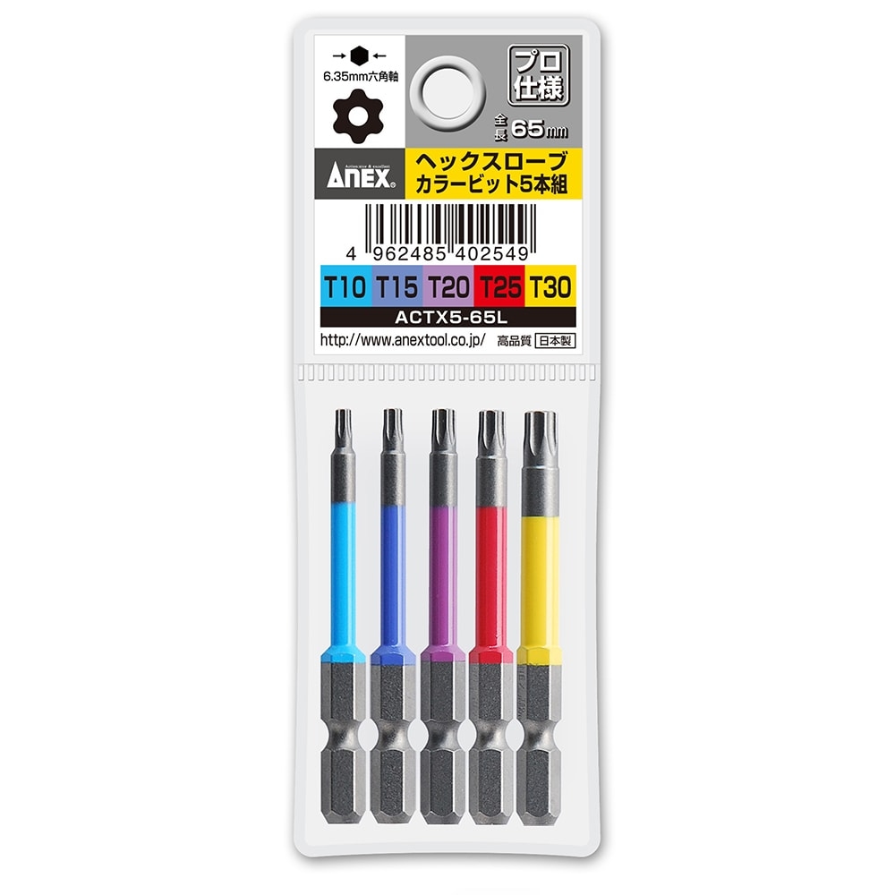 Vỉ 5 mũi vít sao lỗ 5 cái Anex ACTX5-65L Là sản phẩm cao cấp đến từ Nhật bản. Dễ dàng phân biệt kích thước đầu tip với màu sắc. Cả hai đầu đều không sơn để phần sơn không cản trở khi gắn tuốc nơ vít điện. Bộ 5 mũi vít T10, T15, T20, T25, T30 với kích thước thông dụng thường xuyên được sử dụng rất tiện ích. Dụng cụ được sử dụng cho máy bắt vít để siết chặt và nới lỏng các vít và bu lông lục giác. Giúp người dùng hoàn thành công việc dễ dàng, nhanh chóng và hiệu quả.