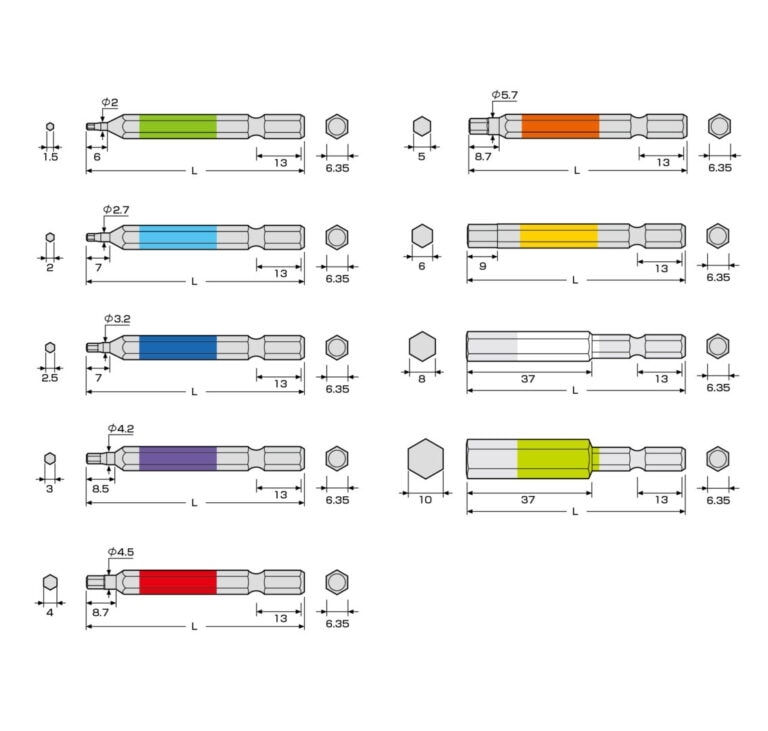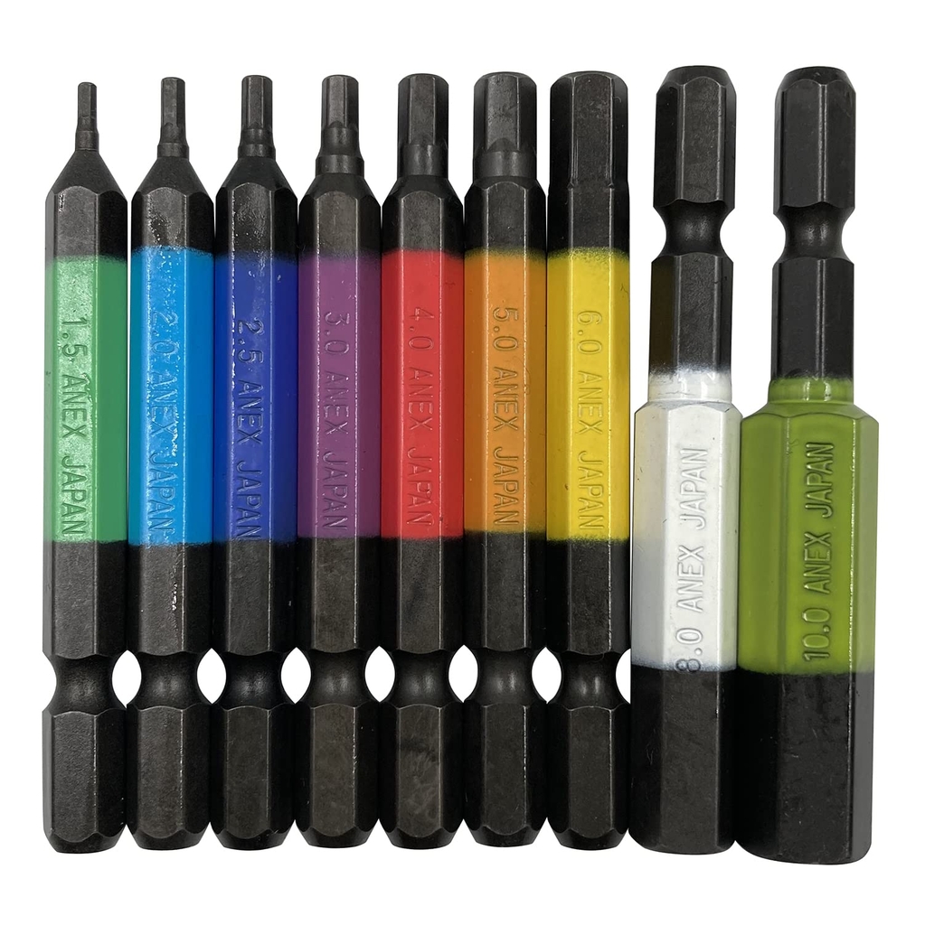 Vỉ 9 mũi vít đầu lục giác Anex ACHX9-65L Là sản phẩm cao cấp đến từ Nhật bản. Dễ dàng phân biệt kích thước của đầu vít bằng màu sắc. Cả hai đầu đều không sơn với độ chính xác tuyệt vời của đầu và để phần sơn không cản trở khi gắn tuốc nơ vít điện. Dụng cụ được sử dụng cho máy bắt vít để vặn các vít có đầu lục giác và bu lông đầu lục giác. Bộ gồm 9 chiếc đủ kích cỡ thuận tiện trong quá trình sử dụng.