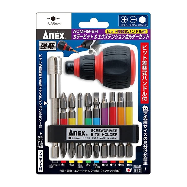 Bộ 9 mũi vít kèm Đầu nối vít và cán Anex ACMH9-EH. Là sản phẩm cao cấp đến từ Nhật bản. Dễ dàng phân biệt kích thước đầu tip theo màu sắc. Có giá đỡ mở rộng có thể kéo dài đầu mũi. Có tay cầm thay thế. Mũi vít được thiết kế có nam châm.